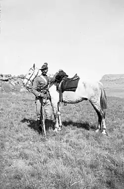After this inconclusive engagement, Carrington gave up the attempt to reach Brakfontein and returned to Mafeking. Paget's Horse had to fight a dismounted action to clear a Boer force blocking the road back, and Maj Paget was slightly wounded. Paget's Horse went back to its camp at Ottoshoop and spent the following weeks patrolling the road between Zeerust and Lichtenberg, fighting three separate engagements with parties of Boers. In one of these Paget's Horse had to saddle-up and gallop out of Ottoshoop to relieve a detachment of the Victorian Rifles pinned down on a kopje. On arrival they dismounted and fired volleys of suppressive fire at the Boers hidden on the opposing kopje, until the Boers withdrew.[23] A large detachment of Paget's Horse was sent by train to Vryburg to join a relief column for Schweizer-Reneke, which was being besieged by the Boers. The march was unopposed and the unit spent a few days patrolling the surrounding country, experiencing a few contacts with small parties of Boers. Paget's having returned to Vryburg, the Boers once again besieged Schweizer-Reneke. This time the unit had to escort a slow convoy of ox-carts, taking a week to cover 35 miles (56 km). This work was typical of the Guerrilla warfare that characterised the next two years of the war. After two such convoys, the detachment returned to the rest of the battalion at Mafeking.[24]