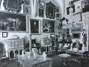 After the extinction of religious orders in 1834, the building was incorporated into the National Treasury and used as a warehouse until it was acquired by João Maria Correia Ayres de Campos, 1st Count of Ameal. In 1895, architect Silva Pinto was hired to adapt it to its new residential function using a neoclassical revivalist design, but most of its significant original features, including its cloister, several of its vaulted late-Gothic interiors and its Renaissance-style portico, were maintained.[2] The latter, which included a significant sculpture group in the style of João de Ruão, figured in the Count's bookplate, designed around 1900. Ayres de Campos famously used the complex to display his vast art collection and to house his library, both of which were among the most important in Portugal at the time.[3]
