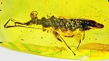 Palaeotanyrhina is a genus of extinct insects in the phylum Arthropoda. The type species Palaeotanyrhina exophthalma had large bulging eyes, an elongated mouth and sticky feet for capturing prey items. P. exophthalma lived 100 million years ago during the Middle Cretaceous period in modern day Myanmar. The specimen was found in amber southwest of Maingkhwan in the Kachin state (26°20'N, 96°36'E).[1]