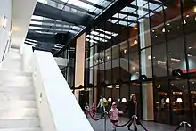 To provide a secure, internal structural link between the Anneau, Ancien Palais, the three Annex buildings, and Towers Perrault designed the Gallery, whose principal component is a glass-roofed indoor street, 300 m long, 8 m wide, and 9.85 m high.[19] As well as providing staff with access to a number of facilities, including a bank, 14 training rooms, a newspaper kiosk and self-service restaurant, the Gallery also houses the CJEU's library.[19] The library opens up onto the Gallery's street over a 70 m distance, and occupies the full height of the structure, containing a three-storey reading room with 80 ergonomic reading stations.[19] The library's collection counts more than 150,000 volumes, with 70,000 covering EU periodicals, EU, comparative and international law and the law of EU Member States being available in the library itself.[19] A further 80,000 volumes covering the laws of certain non-EU Member States, official journals and court reports of EU Member States, and dictionaries are stored in the basement of Tower B, directly accessible via a covered walkway from the library's reading room.[19]