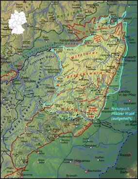 • the Southern Palatinate Forest, the so-called Wasgau, which extends from the Queich and a line from Pirmasens to Landau to the French border in the south.