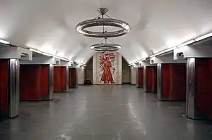 Palats Ukraina (Ukrainian: Палац Україна, ⓘ) is a station on Kyiv Metro's Obolonsko–Teremkivska Line. The station was opened on 30 December 1984, and is named after Ukraine's biggest concert hall located near it. The architecture was designed by A.S. Krushynskyi, T.A. Tselikovska, N. Alyoskin, with other design by S. Kirichenko and R. Kirichenko.