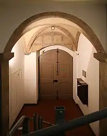 Below are remains of the original structures, as they are in the entrance hall of the palace with ribbed vaults decorated with fourteenth-century motifs, from which the original staircase was accessed. The internal courtyard decorated with graffito is lost.[4] On the left edge of the front on Via degli Strozzi there is a shield (indicated as fifteenth-century, but what we see today is evidently a cast) with the coat of arms of the Anselmi (blue, erased by five pieces of silver). On the corner with Via de' Sassetti is that of the Ristori of the San Giovanni district (golden, with the blue cross set aside by four red roses), placed in 1893.