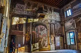 The most important room in the palazzo is the Salone d'Onore, also known as Salone of the Fasti Romani. It consists of two bands: the inferior band depicts the history of Rome, and the superior band displays dames and signori, musicians, servants, and mendicants peering over a balustrade as though a public observation of the feasts for which the room was dedicated.[5]
