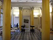 The archive consultation room, rich in stucco and wall paintings, is a fine example of decoration in the style of the early 19th century, with yellow columns standing out against complex white stuccoes, and with a cupola. The musical allegories of the paintings and stuccoes reveal how this was intended as a music hall and dance hall. The monumental staircase also refers to 19th century interventions.[1]