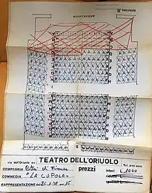 In the courtyard of Palazzo Bastogi was housed, from 1951 to 1993, the Teatro dell’Oriuolo, one of the most important theatres of post-war Florence. Built in wood around 1950 with a capacity of about 150 seats, it was later enlarged with dressing rooms and workshops on the initiative of the Acli-Municipal Employees' Association that had supported its creation, reaching three hundred seats.[4] Already Stable Theatre with an important programme, featuring directors of the calibre of Tatiana Pavlova and actors such as Paola Borboni, Ottavia Piccolo, Ave Ninchi, the brothers Aldo and Carlo Giuffré, Giustino Durano, Arnoldo Foà, etc.