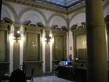 The main doorway opens into an interior courtyard by Zanobi del Rosso with several loggias, again with finestre inginocchiate - initially open to the sky, the courtyard is now covered by a coloured glass ceiling installed in the 20th century after a project by Ulisse De Matteis allowed this space to be turned into a reception area. At the corners of the cornice are several sculpted masks.[2][3]