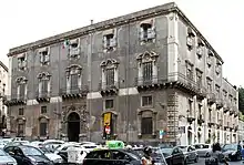 The Palazzo Manganelli is a Baroque monumental palace located in Piazza Manganelli, in the center of the city of Catania, region of Sicily, southern Italy. It is still lived in by heirs of the family, and also houses a hotel. The busy piazza serves mainly as a parking lot; at the north is a civic art gallery, housed in the former church of San Michele Minore. To the south, across Via Antonino di Sangiuliano stands the Teatro Sangiorgi. At one time, a building here housed the Istituto per la Educazione delle Fanciulle (Institute for education of Girls).[1]