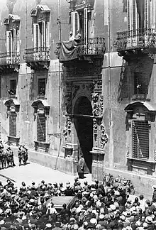 In 1837, a severe cholera outbreak in Catania caused a short rebellion by the populace, who protested in front of this palace, home of the then Catanian governor, the prince of Manganelli.[2] They demanded the appointment of a new sanitary commission. In 1860, the Garibaldini, during their successful conquest of the Neapolitan kingdom, sacked the palace, destroying or looting the contents. In 1873, the level of via Sangiuliano was lowered, requiring further reconstruction, including the addition of the third floor. In the 1870s, the piano nobile was decorated with frescoes by Giuseppe Sciuti and Ernesto Bellandi, working on commission from Princess Angela Paternò di Manganelli Torresi.[3]