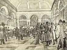 On 27 June 1905 the Nuova Borsa company was founded to build the building, which cost seven million lire at the time.[1] In 1912, the Commodities Exchange remained in the Loggia di Banchi, where it remained until 1985, while the Stock Exchange moved to Piazza De Ferrari, in the newly built building. It was inaugurated on 20 July 1912. It was an event of national importance. During the three days, stockbrokers from all over the country were present and Francesco Saverio Nitti, Minister of Agriculture, Industry and Commerce of the fourth Giolitti government, Francesco Tedesco, Minister of the Treasury and Teobaldo Calissano, Minister of the Post and Telegraphs.[2] Among the other authorities were the marquis Giorgio Doria, representing the mayor Giacomo Grasso, the then president of the chamber of commerce Carlo Dané and Nino Ronco, president of the port consortium and the marquis Giacomo Filippo Durazzo Pallavicini and the president of the stockbrokers' union Giacomo Richini.[1][3]