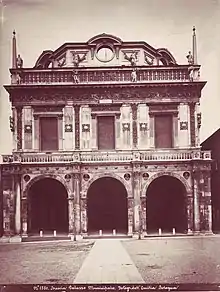 The first stone was laid in 1492. The works were directed by Filippo Grassi,[3] a stonecutter who had already been active in the city for over a decade, and whose professional culmination was this project. The French invasions starting in 1509 and the sack of Brescia in 1512 interrupted construction.[1] The work resumed in 1535 and the palace was completed in 1574 after numerous interventions by the most famous architects of the time, including Jacopo Sansovino, Andrea Palladio, and Lodovico Beretta who completed the building.[4]