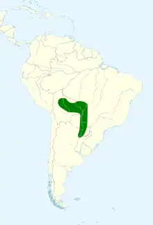 The nominate subspecies of the pale-crested woodpecker is found in central and eastern Bolivia and the western part of Brazil's Mato Grosso state. Subspecies C. l. kerri is found in most of Paraguay, in southern Mato Grosso and the state of Mato Grosso do Sul, and in northeastern Argentina. The species inhabits the somewhat open landscapes of semi-deciduous forest, cerrado woodland, and dry Chaco woodlands; it often is found with palms.[9]