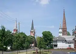 Palmyra claims to be the only city or village in the U.S. to have four churches at a four corner intersection facing each other.[4] It is one of ten places in the world that has four churches on the four corners of two intersecting highways. The "four corners" churches are at the intersection of New York State Route 21 and New York State Route 31.