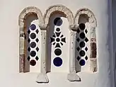 The iconostasis, which separates the eastern end of the main hall of the church from the chancel (called the "bema" in Orthodox tradition), is notable for its brilliantly multicoloured effect.[2] It has the usual five-part structure. The lower part consists of the original furnishings from the construction of the church around 1100. The upper part consists of an engraved wooden post-Byzantine architrave, a frieze with fourteen icons and a carved top.[3] The variety of ornaments is considered unique in the Middle Byzantine Era, with links to the 6th century[2] and to churches in Constantinople, Venice and Ravenna.[4]