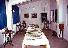 Exhibits include farming tools, traditional dress, firearms and domestic utensils. There are also some ecclesiastical items on display (holy lamps, bells, icons, wreaths, and an altar cloth dating from 1724), an old camera and a large collection of books from the Urban School of Akra.