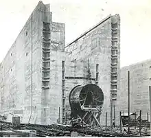 Beyond this, the original design of the locks had yet another safety feature, emergency dams that could be swung across the locks at the upper end of every flight. These consisted of swinging bridges, from which girders were lowered to the lock floor; steel shutters could then be run down these girders to block the flow of water.[8] Never used, they were removed in the 1950s.[6]