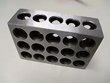 Parallels are rectangular blocks of metal, commonly made from tool steel, stainless steel or cast iron, which have 2,[1] 4 or 6 faces ground or lapped to a precise surface finish. They are used when machining with a mill, drill or any other machining operation that requires work to be held in a vise or with clamps - to keep work parallel or raised evenly such as in a milling vise to give adequate height for the cutting tool/spindle to pass over.