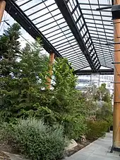 The park is built around a central, rectangular lawn of roughly 273 by 85 metres (895' x 279') in size. It is embellished with two greenhouse pavilions (hosting exotic plants and Mediterranean vegetation) at the eastern, urban end which are separated by a paved area featuring dancing fountains. The south edge of the lawn is bounded by a monumental canal — the "Jardin des Métamorphoses" — composed of an elevated reflecting pool that reaches through granite guard houses, lined by a suspended walkway. On the north side are two sets of small gardens: the six "Serial Gardens", each with a distinct landscape and architectural design and a "Garden in Movement" that presents wild grasses selected to respond at different rates to wind velocity. A 630-meter (690 yard) diagonal path cuts through the park.