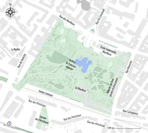 The central entrance gates to the park are topped by two sculptures of bulls by Isidore Bonheur, a note to the site's former use as a slaughterhouse.[3] An old gateway is crowned by a bronze horse's head. The old bell tower of the former fish market stands beside the pond, and the former shelter of the horse market is now used on weekends as a market for old books. The park also has a bust of Georges Brassens made in 1989 by the sculptor André Greck.[4]