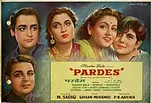 Pardes (transl.Foreign land) is a 1950 Indian Hindi-language romantic drama film directed and written by M. Sadiq.[1] Starring Madhubala, Rehman, Karan Dewan and Shakuntala, the film tells the story of Rajan, a teacher, who falls in love with a wealthy girl named Chanda but decides to go away from her to earn money.[2]