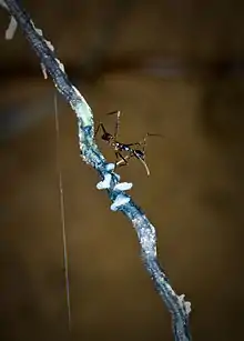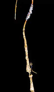 The main physical defense to the nest is the ant guard. Wasps that build their nests on the underside of leaves will add an ant guard to the stem to prevent ants from attacking the nest.[2] Ant guard construction is a behavior peculiar to P. jacobsoni among its genus, although it does occur in some wasps in the genera Eustenogaster and Liostenogaster via a radically different behavioral mechanism.[7] In P. jacobsoni, the ant guard construction is simply a smear of secretion from the Dufour's gland on the nest that forms a sticky obstacle to ants attempting to invade the cells; this prevent ants from attacking, which differs from other social wasps that actually construct physical impediments to ants.[2][9] The ant guard is always added to protect the nest, however, and immediately following the building of the first cell, the ant guard is laid down by the wasp.[5]