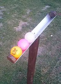 Park golf balls are used in the sport of park golf. They have a weight less than 100 grams (3.5 oz) and diameter of 60 millimetres (2.4 in) and are constructed of durable synthetic resins. They may be translucent or opaque and are manufactured in many different colours. Balls from different manufacturers vary significantly in the way they perform contacting the club, flying through the air and rolling on the grass.