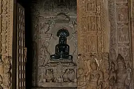 The ceiling of the entrance porch features chain and floral patterns, and a pair of intertwined flying vidyadharas. The door-lintel of the mandapa has the sculpture of Adinatha's attendant: a ten-armed Chakreshvari riding a Garuda. The sanctum features sculptures of the Jinas.[6][7]