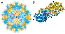 - ↑ Tang, J.; Pan, J.; Havens, W. M.; Ochoa, W. F.; Guu, T. S. Y.; Ghabrial, S. A.; Nibert, M. L.; Tao, Y. J.; Baker, T. S. (2010). "Backbone Trace of Partitivirus Capsid Protein from Electron Cryomicroscopy and Homology Modeling". Biophysical Journal. 99 (2): 685–694. Bibcode:2010BpJ....99..685T. doi:10.1016/j.bpj.2010.04.058. PMC 2905076. PMID 20643089.