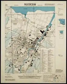 Map issued in February 1946 showing the city of Pasuruan including the main railway line of Staatsspoorwegen (SS) and PsSM's steam tram line