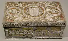 The Victoria and Albert Museum has a Florentine example of a class of "coffrets" intermediate between caskets and cassoni, which is known by the motto Onesta e bella on its top, and would have been an engagement present from the future husband to his bride, formally presented to her by a representative from his family at her house, filled with small presents from the bridegroom's family. Smaller white lead pastiglia caskets were probably also used on such occasions.[28] Made in about 1400, it is only 23 cm high and 61.5 cm wide and decorated with gilded pastiglia scenes made from gesso dura of courtly hunting and jousting on a painted blue field; these were apparently hand-modelled, not cast.[29]