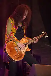 Pata is noted as the only member of X Japan who plays American-made instruments, almost always seen playing a vintage Gibson Les Paul.[3] Previously, he often used a yellow 1959 Les Paul Standard nicknamed "Ichi-Gō" (1号, "Number 1") or his "Honsai" (本妻, "legal wife").[37] Although he still uses it for recording, it has been retired from live performances since 2008 due to its value, which is reportedly enough to buy a house.[37] He now mainly uses a 1955 Goldtop or a black 1975 Les Paul Custom. The Goldtop's paint is rubbed down to the wood, earning it the nickname "Hage" (ハゲ, "Bald").[37] Its pickups and tailpiece were already altered when he acquired it, the former having been swapped out for humbuckers.[37] The black 1975 Custom is nicknamed "Jōmu" (常務, "Managing Director") or "Kuroi Kasu" (黒カス, "Black Cus"), and he has owned it since his amateur days.[37] Since X Japan's reunion, Pata occasionally uses a wine red 1976 Custom, which has a Tom Holmes 453 pickup in the rear.[37] He has owned several other Les Paul Customs, including a white one nicknamed "Shiroi Kasu" (白カス, "White Cus").[37]
