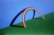 In the 1970s Hughes hung his investigations of perception and illusion on the motif of the rainbow in a series of prints and paintings, such as Pile of Rainbows (1973), Prison Rainbow (1973) and Leaning on a Landscape (1979). Later prints like Leaf Art (1975) and paintings like Realistic Paint (1977) expressed similar interests with colour.[4]