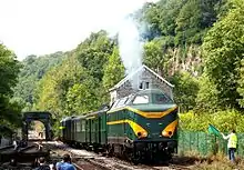 PFT have taken over the 21 km long Ciney – Spontin – Yvoir railway line (also known as line 128) and operate it as the Chemin de fer du Bocq (CFB) heritage railway. It retains a connection to the national network at Ciney, which facilitates PFT using main line locomotives at their events. A gala is held every year around 15 August. During 2012 CrossRail AG provided a class 66 locomotive as a feature. In 2015, 16 kilometers (between Ciney and Evrehailles-Bauche) are operational. In 2016, the terminal section between Ciney and Braibant – which is parallel to the Bruxelles – Luxemburg main line then undergoing a track / overhead renewal – has been rebuilt. Connection with the national railway network at Ciney was suspended for two seasons. Modernization of the main line is continuing and Infrabel plans to free some unused space in Ciney in 2021–2023. This would allow the Chemin de fer du Bocq to have its own separate 2-tracks platform with a connexion to the Infrabel network. In 2019, rotten sleepers and 40 kg/m rails were removed from the 2.6 km section between Evrehailles-Bauche and the Yvoir tunnel. COVID crisis and maintenance tasks with higher priority on the operated section and in Ciney have delayed the track reconstruction schedule that slowly restarted during the summer of 2021.