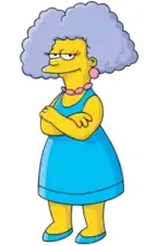 Selma Bouvier is two minutes older than Patty. Due to a childhood bottle rocket accident, she has no sense of taste or smell.[42] According to Marge, Selma "likes Police Academy movies and Hummel figurines, and walking through the park on clear autumn days." In contrast to her twin, Selma yearns for male companionship and children. She is also slightly more sympathetic towards Homer than Patty. Selma helped reunite Homer and Marge after seeing how upset Marge was without him, despite an agreement with Patty not to say anything.[43] Homer was sympathetic to her when she broke down after a disastrous trip to Duff Gardens with Bart and Lisa, remarking "I just couldn't cut it today", referring to raising kids.[44] Homer also agreed to pose as Selma's husband to help her adopt a baby from China.[45] During Homer and Marge's trial separation, when Marge went out on a date with someone else, Selma called Homer and offered to help him save their marriage, but was left frustrated when Homer mistook her for Patty over the phone.[46]