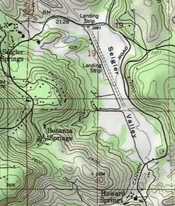 The Paul Hoberg Airport was just below Seigler Springs Resort, 5 miles (8.0 km) southeast of Hoberg's Resort.[1] It was 3 miles (4.8 km) east of Loch Lomond.[2] The airport is at an elevation of 635 metres (2,083 ft).[3] The region has a Köppen climate classification of Csb: Warm-summer Mediterranean climate.[3]