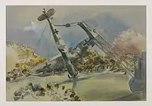 At the start of World War Two Nash was appointed by the War Artists' Advisory Committee to a full-time salaried war artist post attached to the Royal Air Force and the Air Ministry. Nash was unpopular with the Air Ministry representative on the WAAC committee, partly because of the modernist nature of his work and partly because the RAF wanted the WAAC artists to concentrate on producing portraits of their pilots and aircrew.[37] Whilst still a salaried WAAC artist Nash produced two series of watercolours, Raiders and Aerial Creatures. Raiders, or Marching Against England, was a set of studies of crashed German aircraft set in English rural landscapes with titles such as Bomber in the Corn, The Messerschmidt in Windsor Great Park and Under the Cliff. Whilst the Air Ministry could appreciate the patriotic intent and propaganda value of those works, the Aerial Creatures series, with its anthropomorphic depictions of British aircraft, displeased the Air Ministry so much they insisted Nash's full-time contract was ended in December 1940. The Chairman of WAAC, Kenneth Clark was aghast at this development and in January 1941 the Committee agreed to put aside £500 to purchase works from Nash on the theme of aerial conflict.[38][39] Nash worked intermittently under this arrangement until 1944 to produce four paintings for WAAC. The first two of these were Totes Meer (Dead Sea) and Battle of Britain.