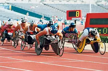 He competed but did not win any medals at the 1992 Barcelona and 1996 Atlanta Paralympics.[4] At the 1994 Commonwealth Games, he won a gold medal in the Men's Wheelchair Marathon and a bronze medal in the Men's Wheelchair 800 m event;.[5] At the 1994 Los Angeles Marathon, Wiggins and fellow French wheelchair racer Philippe Couprie made a pact that they would finish together, thus causing the first dead heat in the history of the competition.[3] He also won that competition in 1995.[6] He was the first person to break the 20-minute mark in the 10 km wheelchair race.[2]
