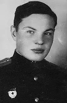 Growing up, his son Pavel nearly drowned three times, the first time when he was six, in the river Mostya, and a second time while travelling to school in Pustotino by boat across a semi-frozen river.[3] He declined to talk about the third time, but concluded that he was not destined to die by water, later carrying a handkerchief embroidered by his mother in his pocket as a talisman when he flew in action.[3] He attended the pedagogical college in the nearby settlement of Sapozhok, graduating in 1940 with the specialty of a teacher in Russian language and literature.[2][4] He joined the Soviet Navy in September that year, and was initially posted to Leningrad as an anti-aircraft battery gunner with the coastal defence forces.[5] He served during the first years of the Axis invasion of the Soviet Union, which began in 1941, and in 1943 graduated from the Nikolaev Naval Aviation School.[1] Because of the war, the school had been evacuated to Bezenchuk, Kuybyshev Oblast.[4] He was promptly posted to serve on the front lines from July 1943, as a crew navigator with Soviet Naval Aviation, rising to flight navigator from May 1944. In common with many of his compatriots, he joined the Communist Party of the Soviet Union, in 1944.[1]