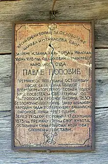 Elijah the Prophet church in Vranić (Barajevo, Municipality of Belgrade, Serbija) - a memorial next to the grave of Pavle Popovic, on the old wooden Church wall