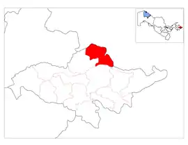 Paxtaobod District (Uzbek: Paxtaobod tumani) is a district of Andijan Region in Uzbekistan. It is bordered with Jalal-Abad Region of Kyrgyzstan. The capital lies at the city Paxtaobod.[1] It has an area of 260 km2 (100 sq mi)[2] and it had 199,900 inhabitants in 2022.[3]