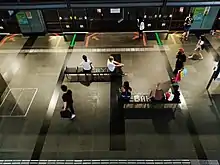 The station also features Art Seats, which have creative design to enhance the commuters' experience on the line.[30] Two entries were selected through the International Art Seats Design Competition in 2006. The first entry – Matrix, which received the top prize in the international competition – consists of a series of benches engraved with the name of the station in a dot-matrix style on the seat surface. Another entry, Rain, showcases steel seats in the shape of water puddles. These seats are also displayed in the other CCL interchange stations.[31]