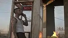 The music video for "Payphone" directed by Samuel Bayer, was shot on April 17 and 18, 2012.[45][46] Lead singer, Adam Levine was spotted shooting the video, making a call from a Los Angeles phone booth, fleeing from the police with model Bregje Heinen and speeding away in a classic sports car.[47][48] It is revealed in the video for Levine's role is a bank worker, he said: "I work at a bank; I have no self-confidence. It's gonna be a very difficult role for me to play because I'm a cocky motherf**ker."[49] The video for "Payphone" premiered on May 9, 2012, on E![50] and was released on Vevo on May 10. It was reportedly similar to The Matrix, The Dark Knight and Die Hard,[51][52] and the high-action FPS video game, Payday: The Heist. The car used in the video, a custom 1967 Shelby Cobra, was a kit-car hand built by car enthusiast Jim Fletcher from Fresno, CA.