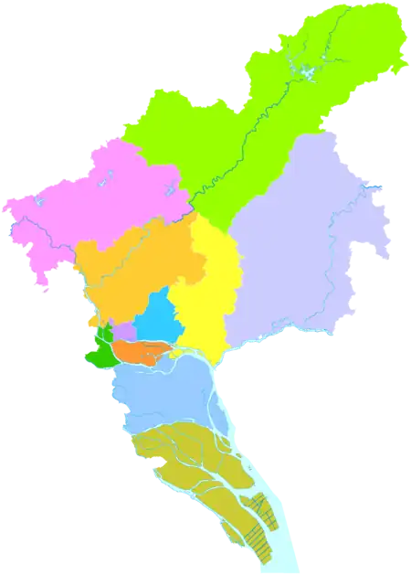 The Dong Jiang flows through Huizhou into the delta. It begins diverging northeast of Dongguan into many distributaries, including the Dongguan Shuidao. Distributuares enter the Pearl River as far north as Luogang and as far south as Hu Men (Tiger Gate).