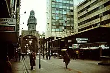 Peatonal Sarandí is an 0.5 miles (850 m) pedestrian street in Ciudad Vieja, Montevideo, Uruguay. It is the main lane of the historic center, and one of the most touristic sites in the city, due to the fact that it is flanked by different architecturally notable buildings.[1] The pedestrian street starts at the Gateway of the Citadel and ends at its intersection with Peatonal Pérez Castellano, while the remaining four blocks, up to the Rambla, are allowed for vehicles.[2] As an extension of this street is the long southern breakwater of the Port of Montevideo, which has taken on the name "Escollera Sarandí".[3]