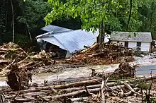 In September 2004, it had a catastrophic flood and mudslide, after massive rains left over from Hurricane Ivan struck the same area soaked by former Hurricane Frances a week before. The slide started on Fishhawk Mountain (also called Big Fish Hawk Mountain), where it continued into the creek. The slide and the water dammed up behind a bridge, then broke through, making the creek about 50 yards (46 m) or meters wide instead of the normal two or three. The mass of trees, boulders, and mud forced at least fifteen houses off their foundations, one man riding his home about 500 feet (150 m) downstream. Another home was pierced by a tree from end to end, the picture appearing in a local newspaper.[2][3]