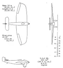 The Rondine is a mid-winged cantilever monoplane built primarily of wood with fabric-covered wings. The fuselage is noteworthy in being clinker or carvel built similar to boat building techniques. The single piece two-spar wings are of low aspect ratio and relatively thick so external bracing is unnecessary. Control is provided by conventional ailerons and rudder, with a small fixed fin and an all-flying tailplane and elevator mounted above the rear fuselage forward of the fin. The fixed undercarriage consists of braced trousered main legs and a tail-skid.[1][2]