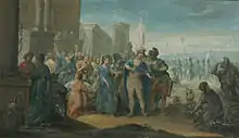 Hörberg also got permission to study the collection of paintings in Drottningholm and took part of some of the Swedish nobleman, portrait painter and royal court painter Ehrenstrahl's works at the Storkyrkan in Stockholm, Sankt Nikolai kyrka (Church of St. Nicholas),[7] in Gamla stan in Stockholm. But already during the time in Växjö Hörberg had seen the graphic works of Raphael (Raffaello Sanzio da Urbino, 1483–1520), the Italian master painter and architect in High Renaissance, and Wierix renaissance works with its numerous figurative scenes in classicism surroundings. The Wierix family (or "Wierix" and other variants) were a Flemish dynasty of printmakers in engraving printmakers in the 16th and early 17th centuries, active in Antwerp and Brussels.