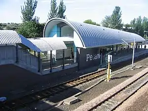 Pelaw was not initially replaced, but following the completion of new housing nearby a new station was built on the site of the old; it opened in September 1985, a year and a half after the South Shields line opened.[3] It then became the terminus of the Yellow Line (from St. James), and the Red Line (from Benton), which has now been discontinued. Terminating trains continued to reverse in the sidings to the east of the station. When the Sunderland extension opened, Pelaw ceased to be a terminus, except in the morning and evening peaks. A grade-separated junction (partly using the existing flyover for South Shields-bound trains) allows Metro services to join the Durham Coast line without conflicting with main line trains.