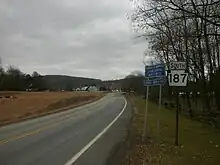 PA 187 begins at an intersection with PA 87 in North Branch Township, Wyoming County, heading north on a two-lane undivided road. The road passes through Lovelton and heads north-northwest through forested areas with some farm fields and homes. The route heads into agricultural areas and turns to the west.[2][3]