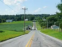 When Pennsylvania legislated routes in 1911, what is now PA 214 was not given a number.[5] By 1930, the road between Rye and Dallastown as an unnumbered paved road.[6] The road between Loganville and Rye was paved by the 1930s.[7] The section of the current route along Church Street and Valley Road heading east from Seven Valleys was paved by 1941.[8] Reynolds Mill Road and West Ore Street in Loganville was paved by 1957.[9] PA 214 was designated in 1961 in order to provide a numbered route at the interchange with I-83 and has followed mostly the same roads as it did when it was first signed.[2] The route previously followed West Ore Street through Loganville before intersecting the Susquehanna Trail and continuing east on its present route.[10]